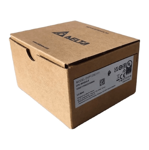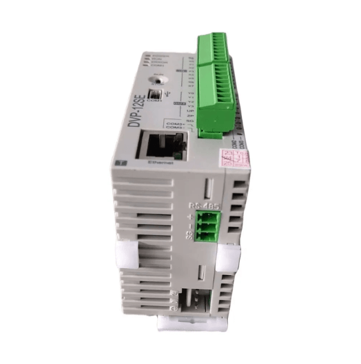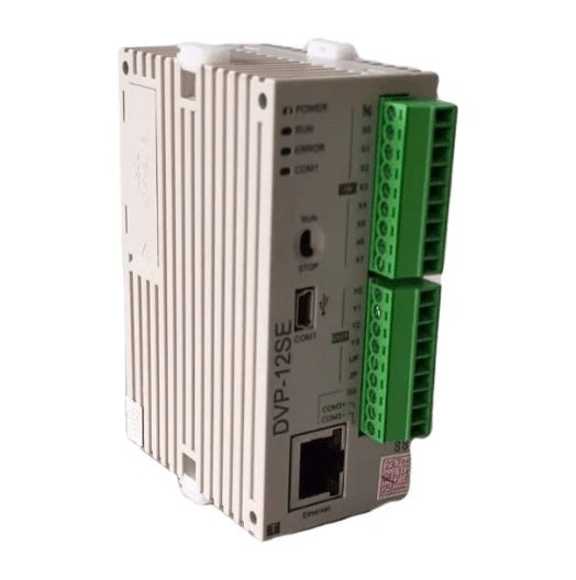 Características deste modelo de CLP: Fabricante: Delta Modelo: DVP12SE11T Série: DVP Capacidade do programa: 16k passos Pontos MPU: 12 (8DI + 4DO) Máx. Pontos de E / S: 492 (12 + 480) Porta COM: RS-232 e 2 portas RS-485 integradas, compatível com o protocolo Modbus ASCII / RTU.Pode ser mestre ou escravo; Ethernet: Integrada suporta MODBUS TCP e Ethernet / IP; Saída de pulso de alta velocidade: Suporta 2 pontos (Y0, Y2) de 100kHz e 2 pontos (Y1, Y3) de saída de pulso de alta velocidade independente de 10kHz; Extensível para Max. 8 Módulos: DVP-SE é extensível para E / S analógica, medição de temperatura, chave DIP de entrada, módulos de comunicação PROFIBUS / DeviceNet e funções de controle de movimento de eixo único. Contadores de alta velocidade integrados.