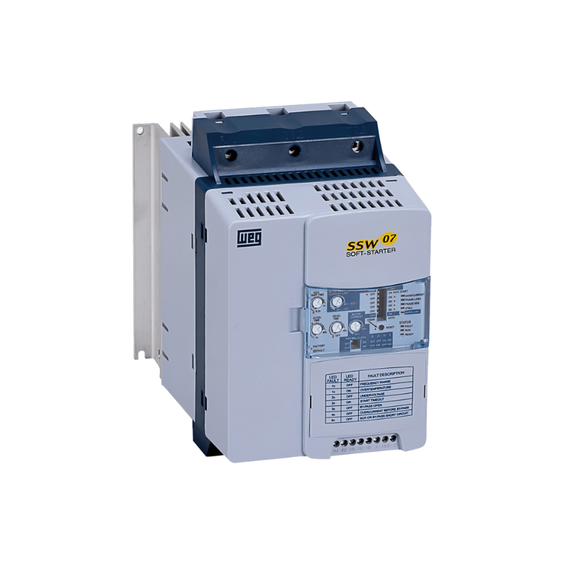 Partida suave, proteção total. O Soft-Starter WEG elimina os trancos na partida de motores, aumentando a vida útil dos equipamentos e reduzindo o estresse na rede elétrica.
